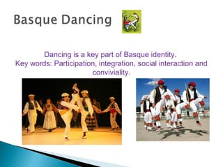 Dancing plays a key role in Basque identity and includes traditional carnivals, processions, and parades as well as modern creations. Music also occupies a central place in Basque culture, ranging from folk instruments like the alboka and txalaparta to modern genres such as punk and metal. Singing traditions have been passed down orally for generations through ballads dating back to the 15th century.