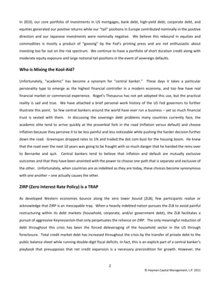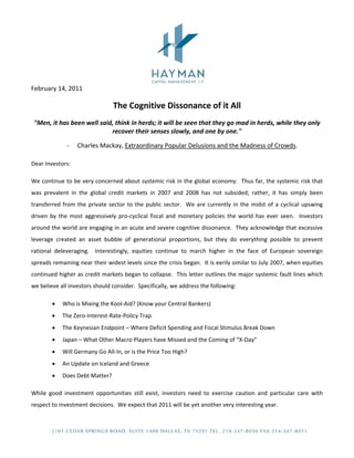 This document provides a summary of major systemic risks in the global economy as seen by the author. It discusses how systemic risk was transferred from the private sector to governments and how investors are engaging in "cognitive dissonance" by acknowledging past excesses but preventing rational deleveraging. The author outlines several fault lines including aggressive monetary policies, the risks of zero interest rate policies, the limits of deficit spending, and debt levels around the world. While opportunities still exist, the author advises exercising caution given expected volatility in 2011.