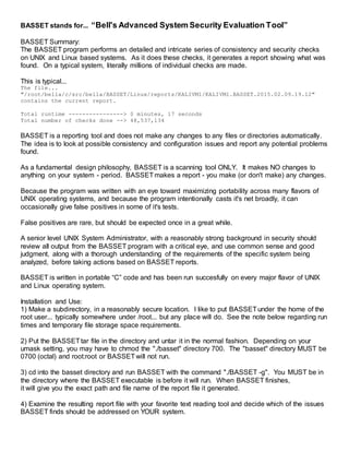BASSET stands for "Bell's Advanced System Security Evaluation Tool" and performs detailed consistency and security checks on UNIX and Linux systems. It generates a report showing any potential problems found. On the system analyzed, BASSET performed over 48 million individual checks and generated a report file containing the results. BASSET is a scanning tool that makes no changes to the system and instead generates a report of findings for the administrator to review.