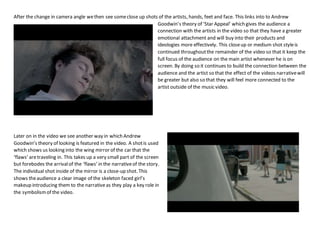 2) Various shots and camera techniques are used to build a connection between the artist and audience, including close-ups of the artist and shots following his point of view.