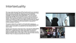 The music video for Bastille's "Send Them Off" features intertextual references to their album marketing campaign. It continues the narrative established in previous videos and keeps fans engaged. The lyrics about demons are represented visually through a shadow following the main character and strange hallucinatory events. While Bastille are not the main focus, close-ups maintain the connection with audiences. Technical aspects like camera angles, effects, and fast cutting establish an unsettling tone and the character's vulnerable mental state.