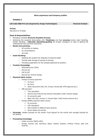 This document summarizes the work experience and qualifications of Baswaraj S Patil. He is currently a Financial Analyst at LSI India R&D Pvt Ltd (acquired by Avago Technologies), where he has worked since 2012. Previously, he worked at EXL Services as a Senior Process Associate from 2007 to 2012. He has 7 years of experience in accounts payable, financial reporting, and ensuring compliance. He is proficient in SAP, PeopleSoft, and Microsoft Office applications. He holds an MBA in Finance from VTU and a Bachelor of Commerce degree.