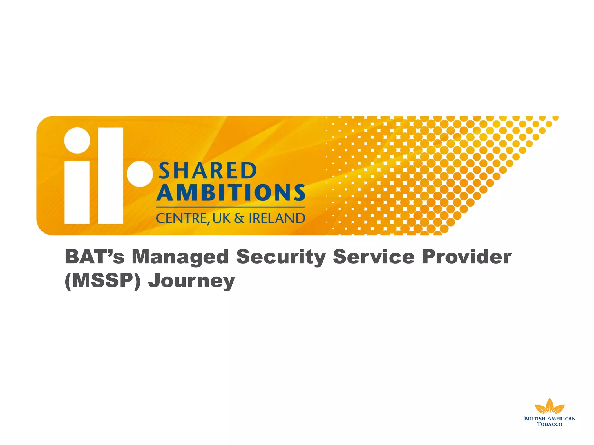 BAT, a large tobacco company, is undergoing a business transformation and looking to consolidate IT systems. It has outsourced some security functions to a managed security service provider (MSSP) to gain efficiencies. The outsourcing has had some successes like a global firewall and endpoint security, but also issues around costs, customization needs, and meeting expectations. As threats grow more sophisticated, BAT will need to ensure its outsourced security controls can address advanced attacks and that the MSSP aligns with its strategic security needs.