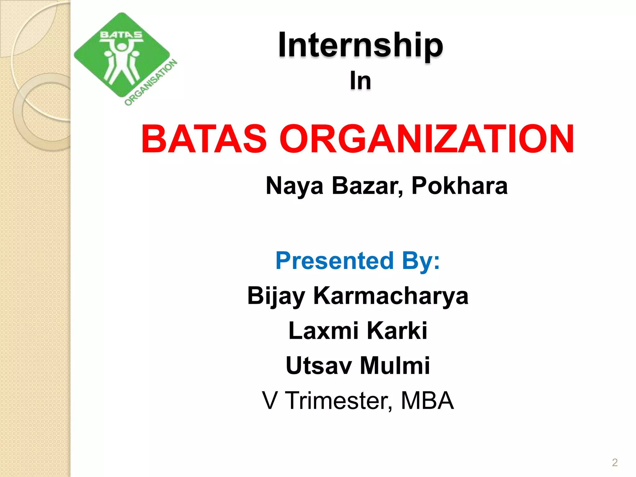 The presentation summarizes the internship of three MBA students at Batas Organization in Pokhara, Nepal. Batas Organization has 14 subsidiaries focused on automobiles, finance, energy, travel, and retail. The interns worked in HR, Mahindra sales, and ASB Automobiles sales departments, performing tasks like customer service, document preparation, and data entry. Key lessons included time management, accounting software skills, and the importance of discipline, punctuality, and cooperation in the workplace. Feedback for the organization and university was provided to improve internship guidance and coordination between parties.