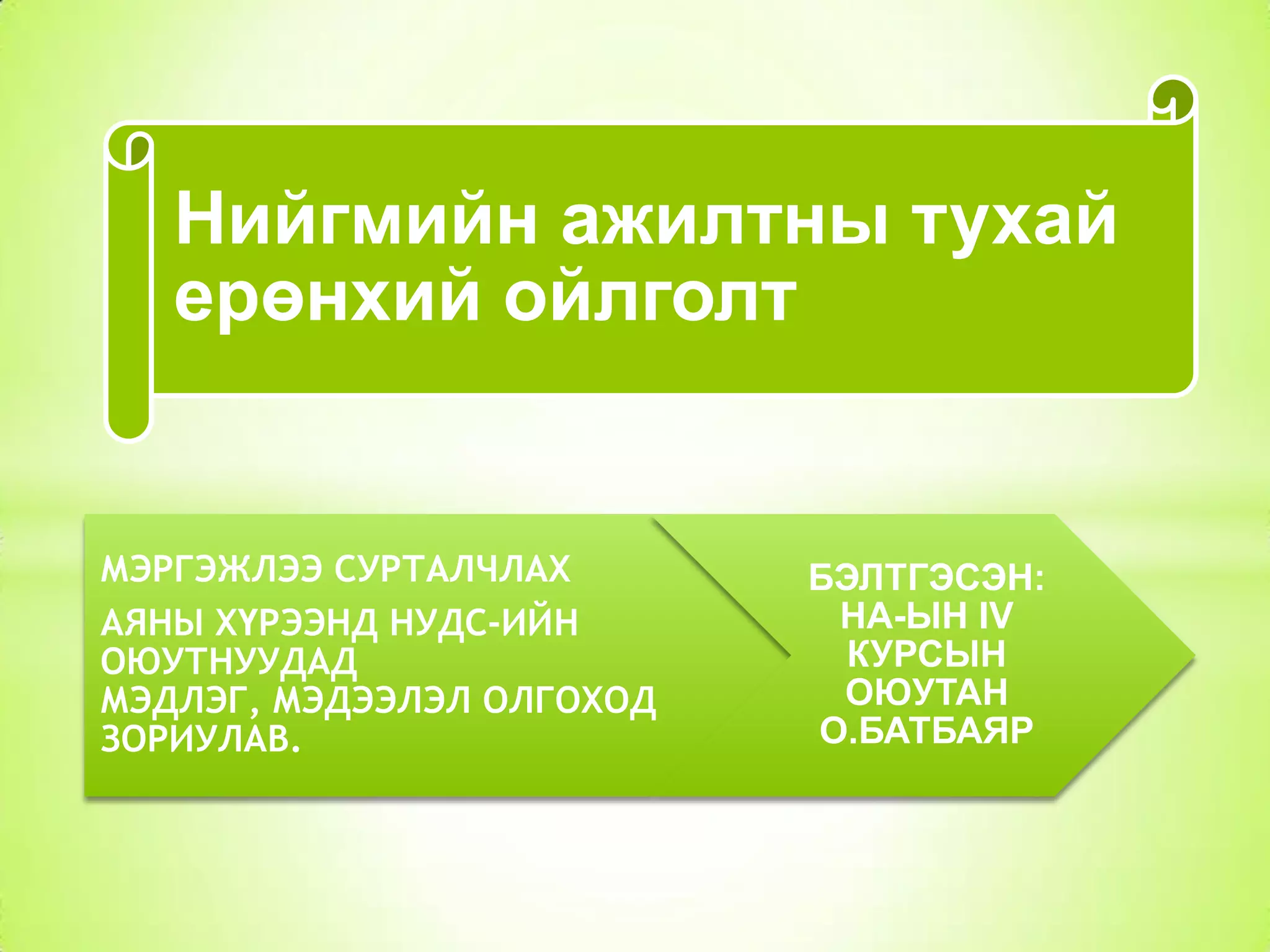 ойлголт МЭРГЭЖЛЭЭ СУРТАЛЧЛАХ АЯНЫ ХҮРЭЭНД НУДС-ИЙН ОЮУТНУУДАД МЭДЛЭГ, МЭДЭЭЛЭЛ ОЛГОХОД ЗОРИУЛАВ. БЭЛТГЭСЭН: НА-ЫН IV КУРСЫН ОЮУТАН О.БАТБАЯР