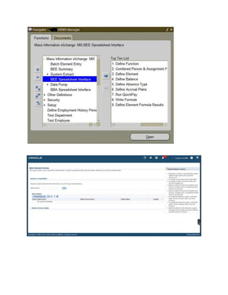The document describes how to use the Batch Element Entry Spreadsheet Interface (BEE) to upload multiple assignment lines to elements or element sets in Oracle. Key steps include: