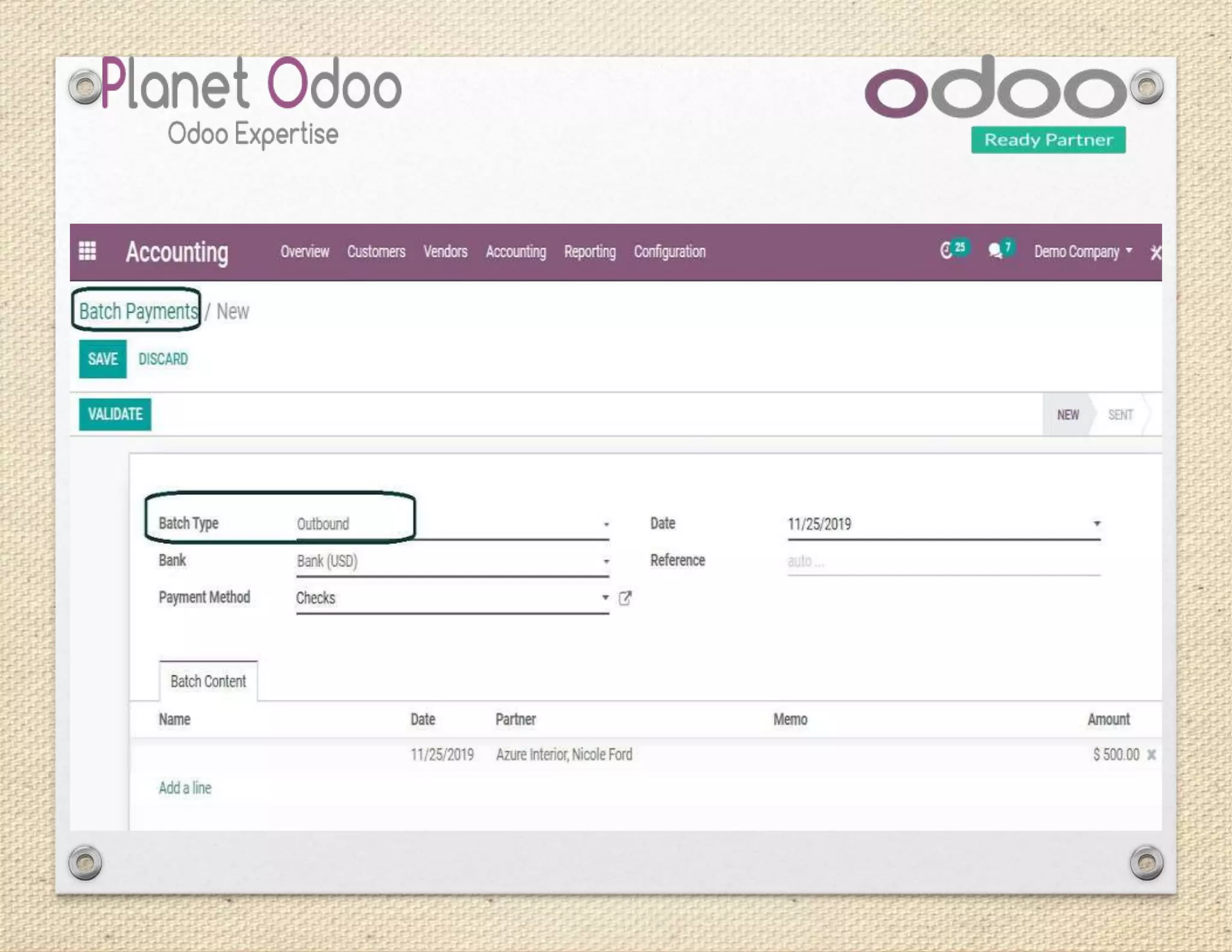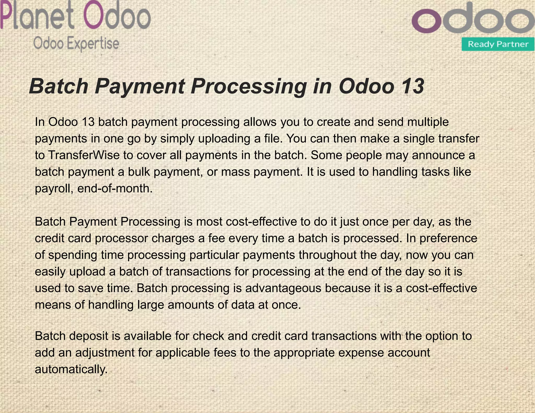 Batch payment processing in Odoo 13 allows uploading a file to create and send multiple payments with a single transfer, saving time and money compared to individual payments. There are two types of batch payments: inbound for customers and outbound for vendors. Configuration involves installing accounting apps, enabling batch payments, creating customer and vendor batches, payment methods, and bank statements for reconciliation.