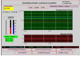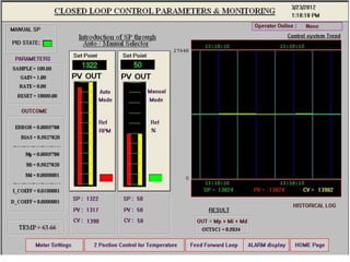 This document describes the development of a dynamic control system for industrial applications using a Siemens S7-300 PLC and various sensors. The system uses two-position control, feedforward control based on linear relationships between process variables, and feedback control using a PID algorithm. It allows both manual and automatic control modes. Data is exchanged between the PLC and SCADA software using OPC/DDE communication.