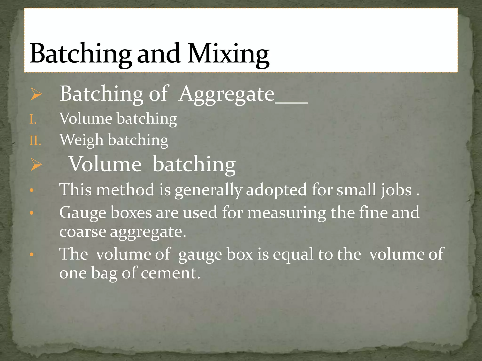 This document discusses different methods of batching and mixing concrete. It describes volume batching using gauge boxes and weigh batching using manual, semi-automatic, and fully automatic equipment. It also discusses hand mixing and machine mixing concrete, including different types of concrete mixers classified by operating conditions and mixing principles. Batch mixers are further classified as tilting, non-tilting, and reversing types based on their drum movement and charging/discharging operations.