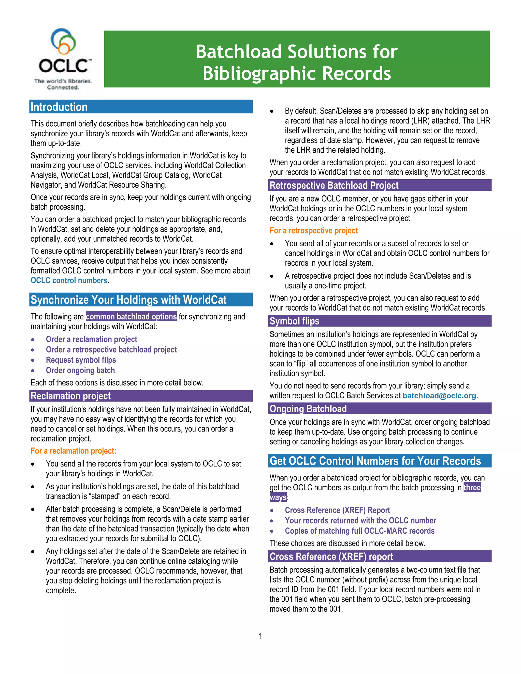 Batchloading can help synchronize a library's bibliographic records with WorldCat and keep them up-to-date. A library can order various batchload projects including reclamation projects to set holdings, retrospective projects to fill gaps, and ongoing batchloads to maintain current holdings. The document describes how to order standard and non-standard batchload projects through OCLC and ensure optimal processing of records and output of OCLC numbers and reports.