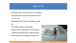 BatchMaster ERP is a comprehensive software for emerging formula-based manufacturers, featuring GST readiness and tools for managing complex taxation processes. It offers capabilities such as easy invoice generation, tax compliance, and support for multiple branches, aiding in transition to the GST system. The software streamlines GST returns and integrates with GST portals, ensuring accurate tax reporting and handling of input tax credits.