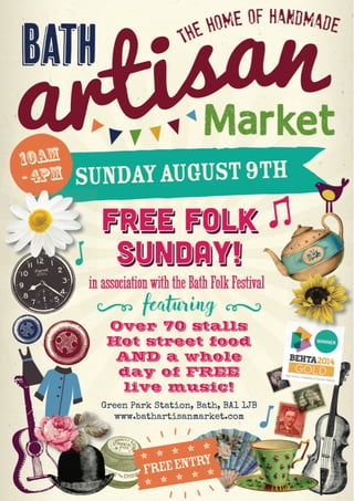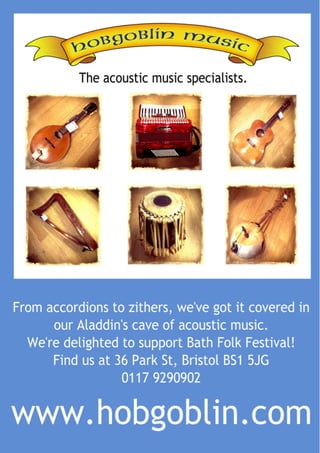 The Bath Folk Festival 2015 features a diverse range of music, dance, storytelling, and art, with highlights including performances by Flook, a free open-air ceilidh, and an art exhibition. The festival includes a traditional music summer school offering intensive workshops and a youth band performance, as well as numerous local partnerships to enhance the event. For a week, participants can enjoy a packed schedule of activities in various venues throughout Bath, celebrating folk culture and community.