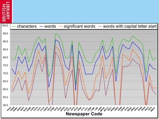 The document outlines the British Library's digitization program funded by JISC, aimed at providing online access to historic UK newspapers for academic purposes, totaling 3 million pages from various titles. Key challenges include varying print quality, OCR accuracy, and the complexity of newspaper layouts, with a commitment to enhancing user access. The initiative serves as a model for future projects, emphasizing the importance of good quality OCR in accessing historical content.