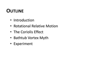 (1) The document discusses the myth that the direction of bathtub vortices is determined by the Coriolis effect due to Earth's rotation.