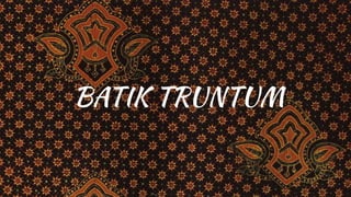 Batik tradisional Indonesia adalah seni membatik yang memiliki nilai budaya tinggi, dengan motif yang diatur oleh aturan tertentu. Awalnya, batik hanya boleh dikenakan oleh bangsawan, tetapi kini bisa dipakai oleh semua kalangan, dengan jenis dan corak yang beragam sesuai budaya daerah. Proses membatik melibatkan berbagai alat dan teknik, serta pewarna alami atau sintetis untuk menciptakan motif yang kaya akan makna, seperti motif batik truntum yang melambangkan cinta dan harapan dalam pernikahan.