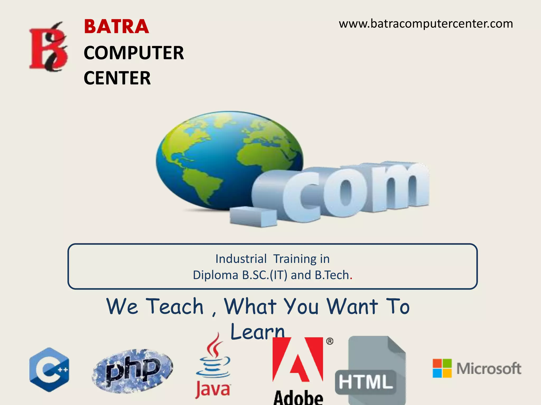 The document describes the courses offered at Batra Computer Center. The center provides industrial training in diploma, B.Sc. (IT), and B.Tech programs. Courses include basics of computers, C and C++ programming, web design, web development, SEO, Photoshop, and Corel Draw. For programming courses, students get hands-on practice through 150-200 practice programs. Web design covers HTML5, JavaScript, CSS, webpage creation, and Dreamweaver/Notepad++. Web development focuses on PHP, SQL, server controls, sessions, and cookies. SEO training covers search engine basics, keyword research, on-page optimization, social media, and more. The center is located