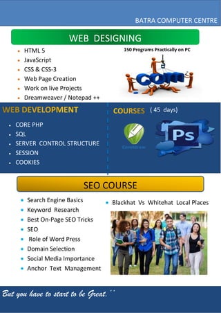 The document outlines computer programming courses offered by Batra Computer Centre including C and C++ programming, web designing using HTML, CSS, JavaScript, PHP, and SEO. Some key topics covered are control statements, functions, arrays, pointers, classes, objects, inheritance, and constructor/destructor in C/C++, web page creation using Dreamweaver/Notepad++, PHP, SQL, and server-side scripting. For SEO training, topics include search engine basics, keyword research, on-page optimization, the role of WordPress, domain selection, and social media. Hands-on practice is provided through 150-200 programming exercises on PC for each course.