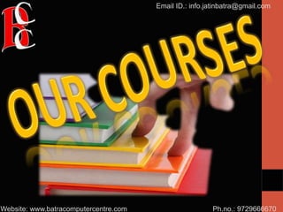 The document contains repeated contact information for Batra Computer Centre, including phone numbers, email, and website. It outlines various computer and software training topics, practical knowledge focus, equipped labs, and additional resources like a library and placement cell. There are also mentions of various subjects in computer science, programming, web development, and SEO strategies.