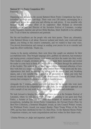 This document provides information about the Battered Moons Poetry Competition 2011, including the 7 winning poems and 3 additional poems by organizers. It introduces the competition judges and winners, whose poems are included. It describes the competition receiving over 150 entries in its second year and being made possible by various supporters. The competition aimed to share accomplished poems that grabbed attention and had resonance. The winning poems are arranged to provide contrast between each other like a recital. Biographies of the winners and judges are also provided.