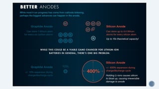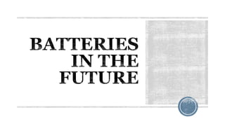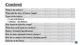 The document discusses various types of batteries, including lead-acid and lithium-ion, their characteristics, weight, and technical specifications. It also covers the principles of battery operation, charging methods, and future advancements in battery technology. Additionally, it provides insights into how to improve battery charging speed and includes references for further reading.