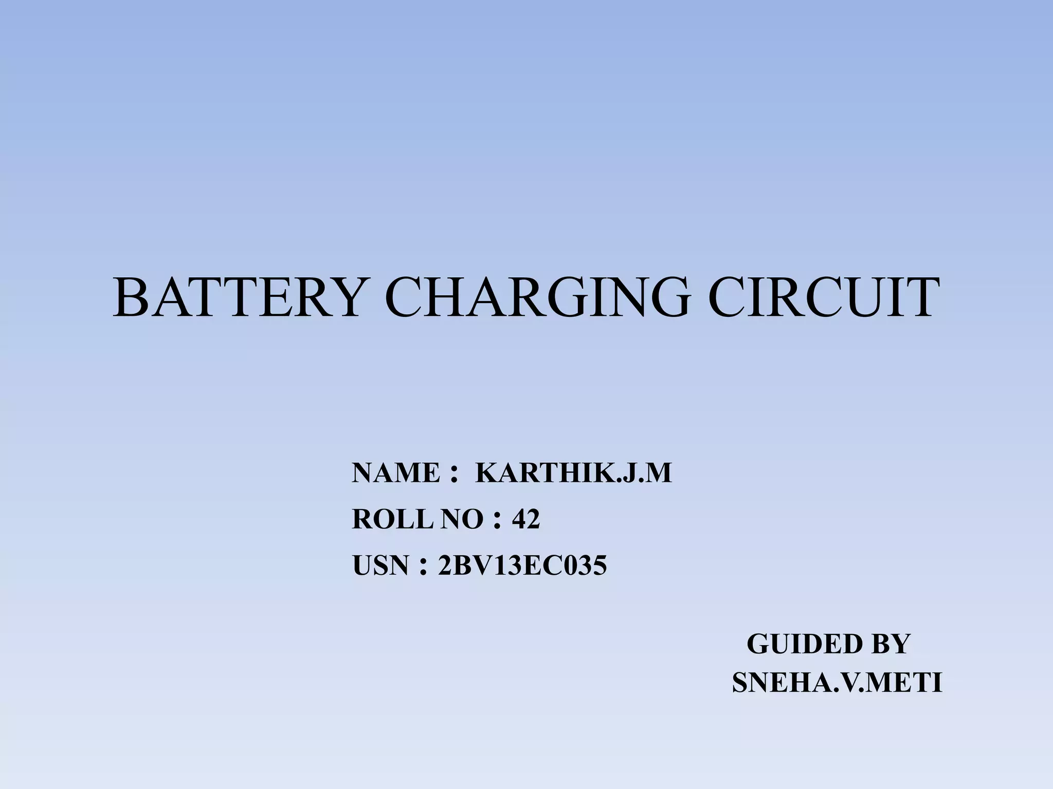 This document describes a battery charging circuit that uses an operational amplifier (OP-AMP) and transistor for current limiting. It includes the circuit diagram, outlines the working, and lists some resources for more information. The circuit uses a potentiometer and OP-AMP as a constant current source, with a transistor to boost the output current. A sense resistor is used to measure the charging current by dividing the voltage drop across it. The circuit provides current limiting to protect the battery during charging.