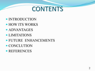 This document discusses a batteryless phone prototype that was developed by researchers. The phone is able to operate without a battery by harvesting energy from ambient light and radio frequency signals using a small photo diode. It converts the harvested light and RF energy into direct current power that allows the phone to perform basic calling functions. While this prototype demonstrates the potential of batteryless phones, their range is currently limited and they lack many features of traditional smartphones. Researchers hope to expand the technology to add capabilities like encryption, video streaming, and internet access in the future.