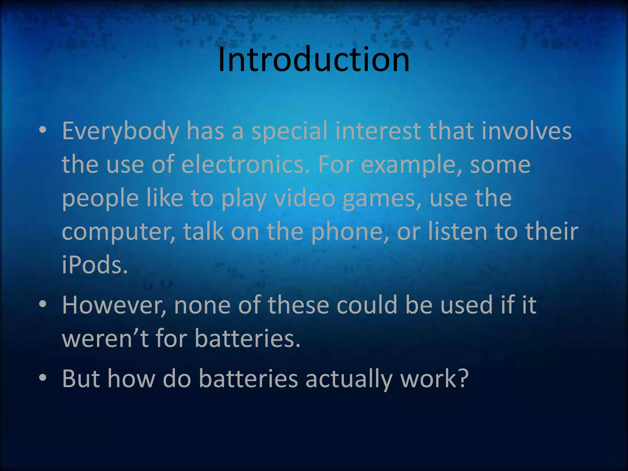 The document discusses how batteries work and the key elements involved. It explains that a battery uses a chemical reaction between its electrodes and electrolyte to produce electrons that flow through an external circuit. The main elements are lithium, sulfur, and zinc. Lithium is used in the anode, sulfur is used in the electrolyte, and zinc can be used in the container. The document also mentions that Toyota is working on developing new magnesium-sulfur batteries for electric cars that could hold twice as much power as lithium-ion batteries.