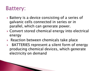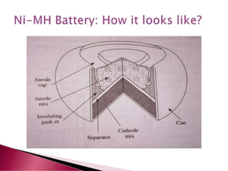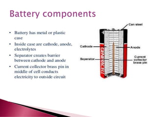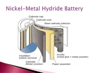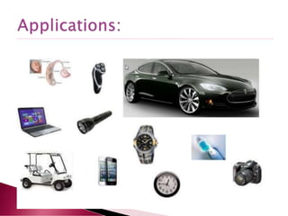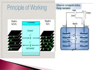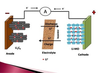 A lithium ion battery consists of a graphite anode, lithium metal oxide cathode, and electrolyte. Lithium ions move between the anode and cathode during charging and discharging, producing electricity. Key developments included the use of cobalt oxide and other metal oxides in the cathode by Goodenough, improving voltage and capacity. Lithium ion batteries now power many electronic devices due to their high energy density and ability to be recharged hundreds of times.