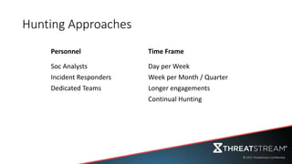 The document outlines a comprehensive approach to enhancing security response procedures, emphasizing data collection and continual threat hunting. It describes various engagement strategies, including different levels of staff involvement and tactics, to improve security operations and address identified vulnerabilities. Key focus areas include server-side compromises, credential reuse, and the analysis of web access logs to identify potential threats.