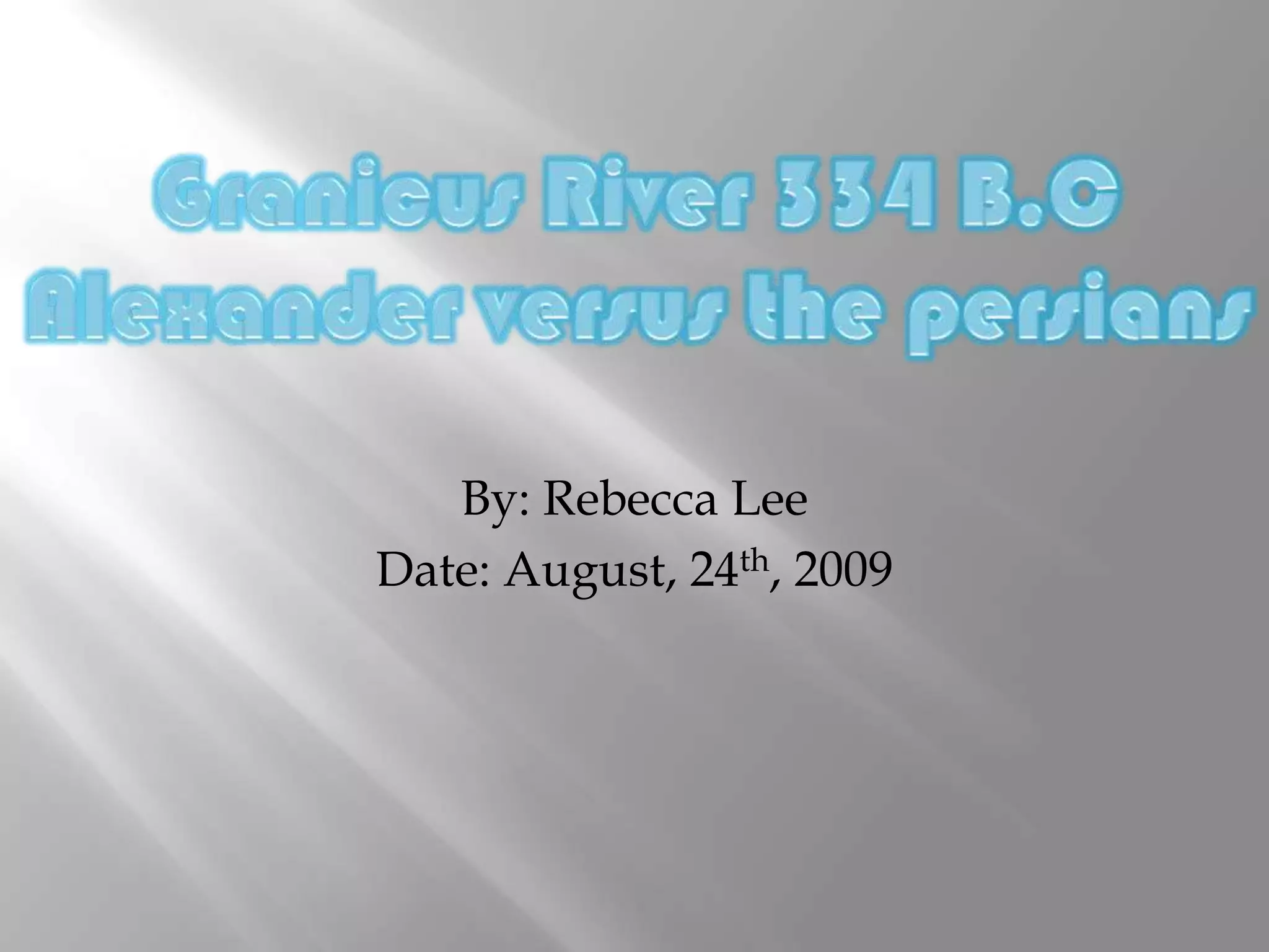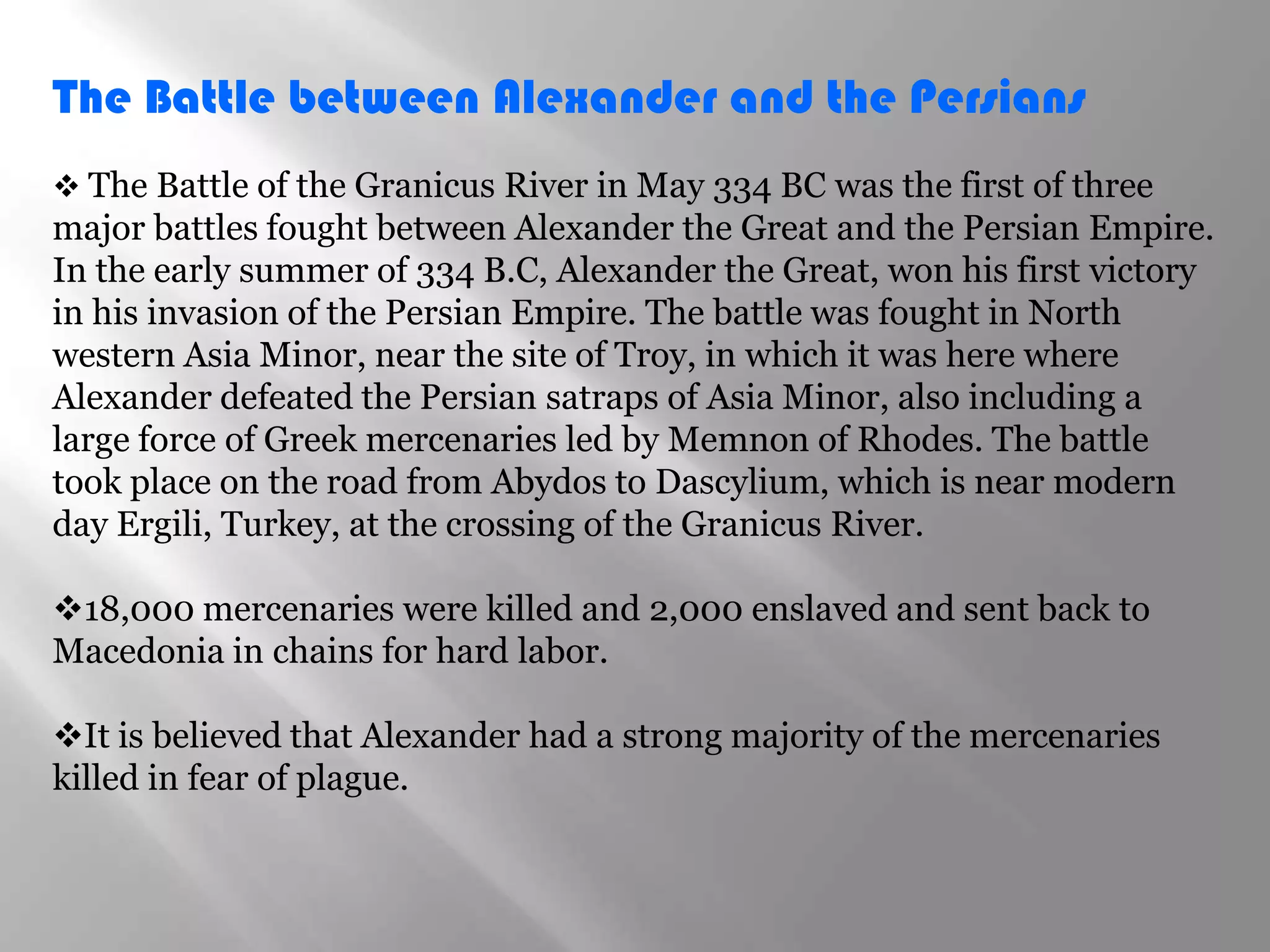 The Battle of the Granicus River in May 334 BC was the first major battle between Alexander the Great and the Persian Empire. Alexander led his cavalry across the river and engaged the Persians, nearly being killed before his general Cleitus saved him. Alexander's forces defeated the Persians, killing 18,000 mercenaries. This victory allowed Alexander to begin conquering the Persian Empire's territories in Asia Minor.