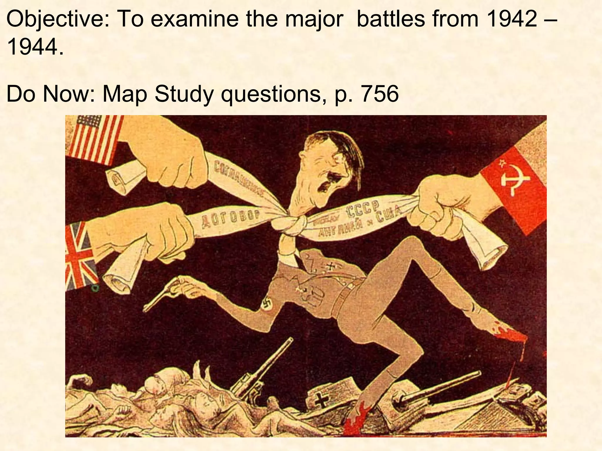 The document summarizes several major World War 2 battles between 1942-1944 in both the Pacific and European theaters. It describes Japan's victories over Allied forces after Pearl Harbor. It then discusses key Allied victories including the Battle of Midway where the US sank four Japanese carriers, limiting Japan's ability to attack further. It also discusses the Battle of El Alamein where British and US forces drove German forces back in North Africa. Finally, it provides details on the massive D-Day invasion of Normandy on June 6, 1944 that marked a turning point as the Allies began to push German forces back across Europe.