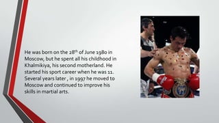 Batu Khasikov is a sportsman from Moscow who inspired the author. He started his sports career at age 11 in Khalmikiya. In 1997, he moved to Moscow to improve his martial arts skills. He won his first karate championship series in 2001. Later he competed in various combat styles and was offered international opportunities. His achievements include being world champion in kickboxing in 2010 and Thai boxing in 2012. He also appeared in documentary films about his life and training that inspired the author in their own sports career.