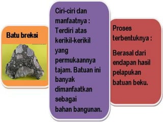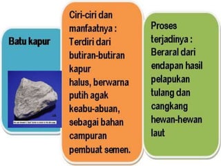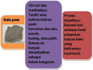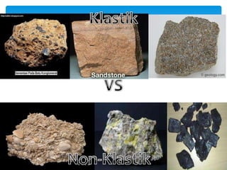 Batuan sedimen terbentuk dari endapan sedimen yang mengalami proses kompaksi dan sementasi. Terdiri dari batuan klastik yang berasal dari erosi batuan lain, dan non-klastik yang berasal dari endapan kimiawi/biokimia. Memiliki ciri berlapis, mengandung fosil, dan terdiri dari fragmen butiran.