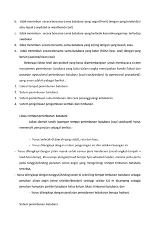 Teks tersebut membahas tentang sistem dan rekayasa penimbunan batubara. Ada dua cara penimbunan yaitu di lapangan terbuka atau menggunakan silo, dimana cara yang paling umum adalah menggunakan lapangan terbuka. Teks ini juga menjelaskan faktor-faktor yang perlu diperhatikan dalam penimbunan batubara seperti lokasi, sistem pemantauan suhu, dan pengelolaan pengambilan batubara.