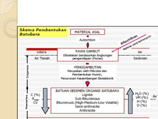 Batubara terbentuk melalui proses diagenetik dan geokimia selama jutaan tahun. Ada dua teori pembentukannya, yaitu teori rawa (pembentukan dari sisa tumbuhan di rawa gambut) dan teori transportasi (akumulasi bahan dari perpindahan di perairan). Batubara memiliki keunggulan sebagai sumber energi yang melimpah, tetapi juga berdampak negatif terhadap lingkungan karena emisi karbonnya. Terdapat berbagai