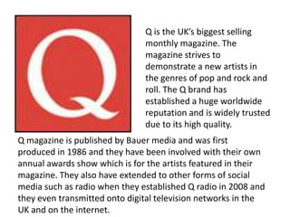 Q magazine is the UK's biggest selling monthly magazine focused on pop and rock music. Since 1986, it has demonstrated new artists in these genres and established a worldwide reputation for its high quality. It has expanded with an annual awards show, radio station, and digital television presence. Kerrang! and Mojo are also music magazines published by Bauer that focus on rock, indie, and classic rock genres respectively. Both have expanded their brands through various social media platforms and events over the years. Mojo is particularly known for its high-quality photographs appreciated by devoted music fans.