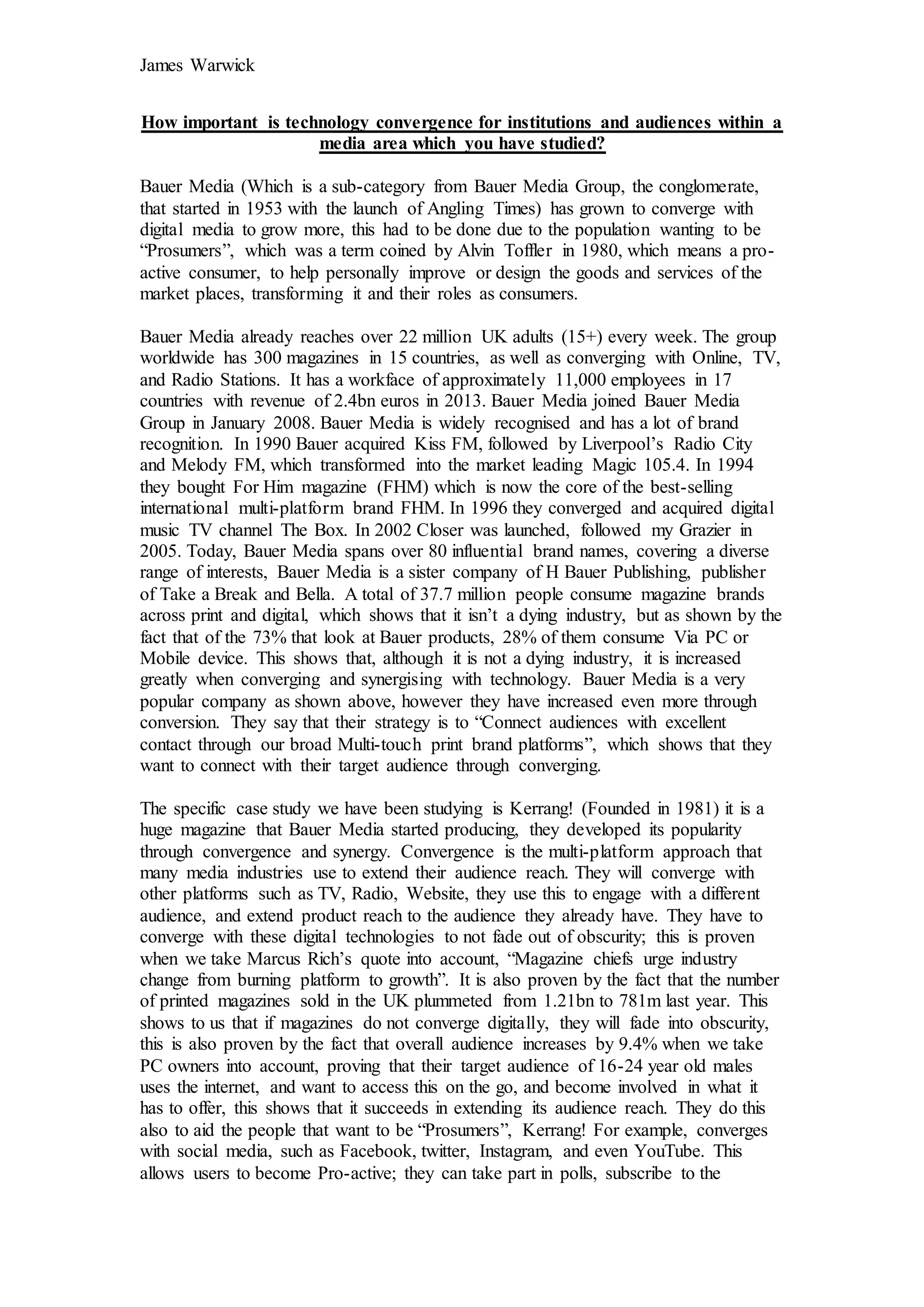 2) Specifically, Kerrang!, a magazine founded in 1981 by Bauer Media, has developed its popularity through convergence by extending its brand across TV, radio, websites, social media, and mobile apps.