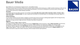 Bauer Media UK is a subsidiary of Bauer Media Group, Europe's largest privately-owned media group. Bauer Media UK operates iconic multi-platform brands across various media in the UK, reaching over 25 million consumers. Its portfolio includes magazines such as heat, KISS, Grazia, Empire, as well as radio stations like Absolute Radio. While Bauer Media owns many well-known and successful magazines, it does not currently own a men's fashion magazine, indicating a potential gap in the market.