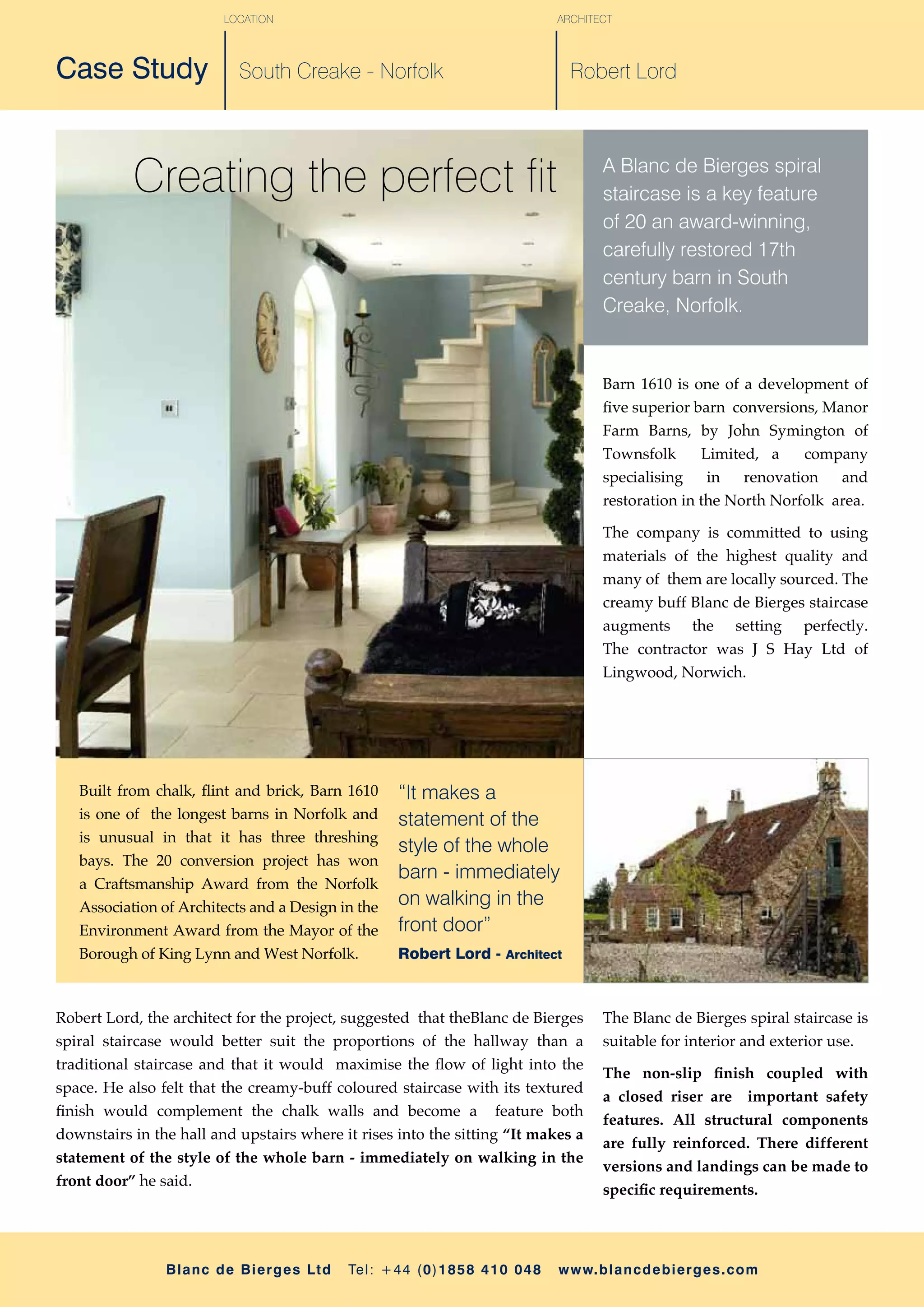 This document provides a case study of a 17th century barn conversion in South Creake, Norfolk that features a Blanc de Bierges spiral staircase. The architect, Robert Lord, suggested the spiral staircase as it would better suit the proportions of the hallway and maximize light. The creamy-buff colored staircase complements the chalk walls and becomes a feature. The barn conversion project won architectural awards and the Blanc de Bierges staircase augments the setting perfectly.