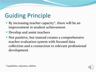 The document provides an overview of the teacher appraisal system being developed in response to state legislation. Key aspects include: