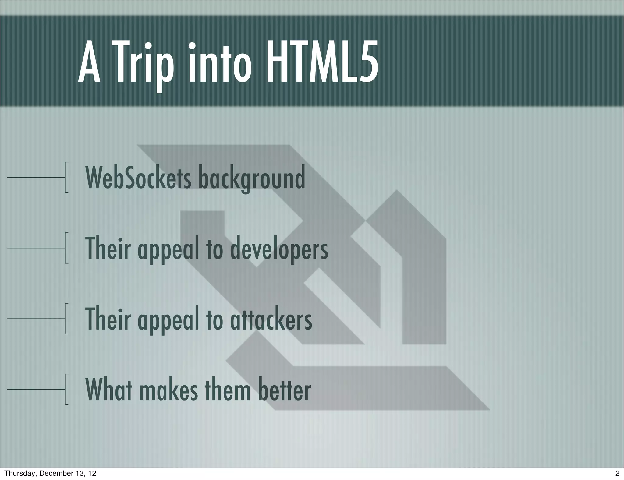 WebSockets allow for two-way communication between a client and server using a single connection. They provide a more efficient alternative to previous solutions like long-polling that required separate connections. While WebSockets improve performance, they also introduce some security concerns due to their ability to establish persistent connections that bypass some cross-origin protections. Attackers could potentially abuse WebSockets to conduct denial of service attacks or inject malicious content into connections. Web developers need to ensure proper security practices like using TLS to prevent issues with mixed content or connection interception.