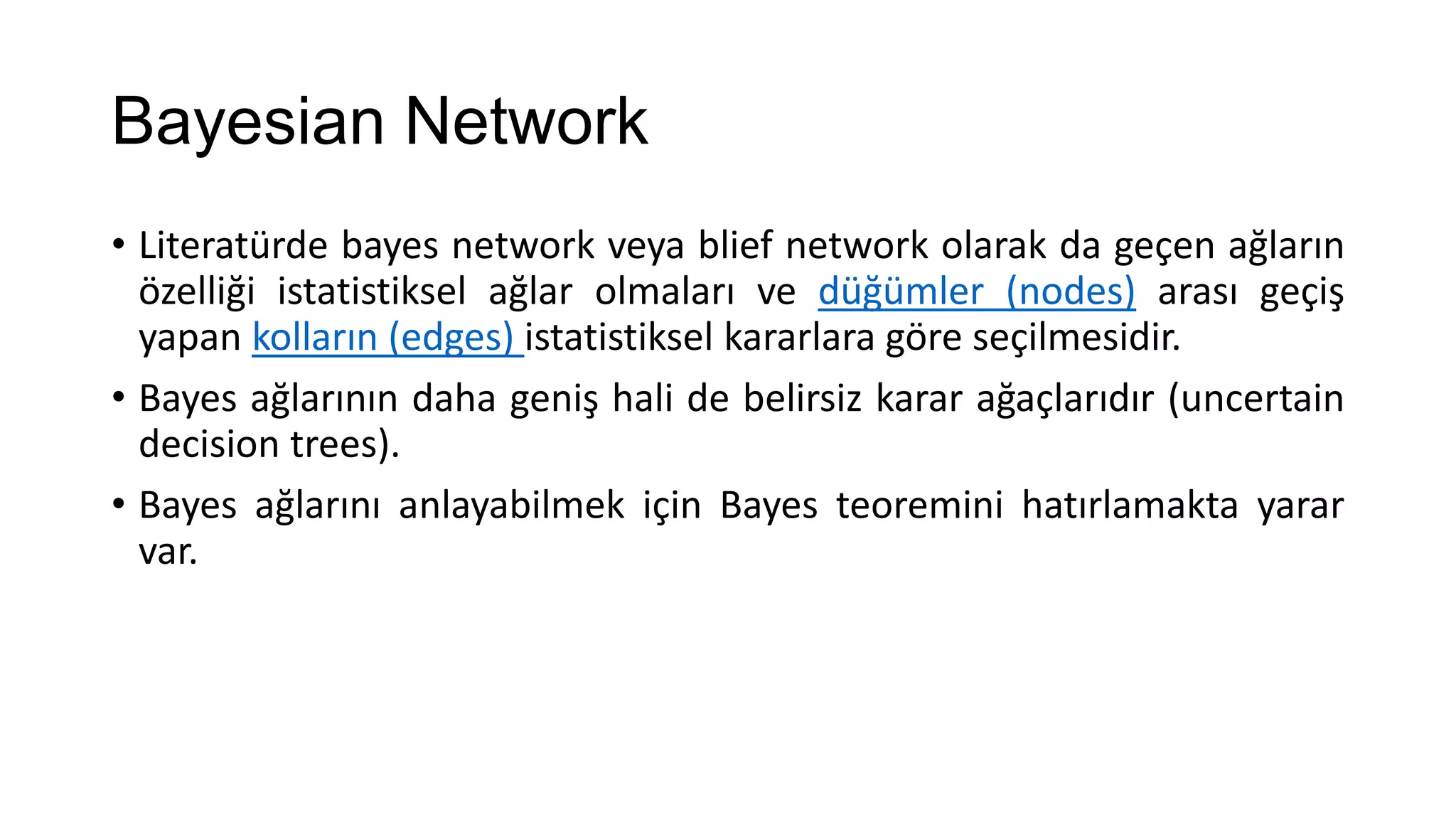 • Bayes ağlarının daha geniş hali de belirsiz karar ağaçlarıdır (uncertain