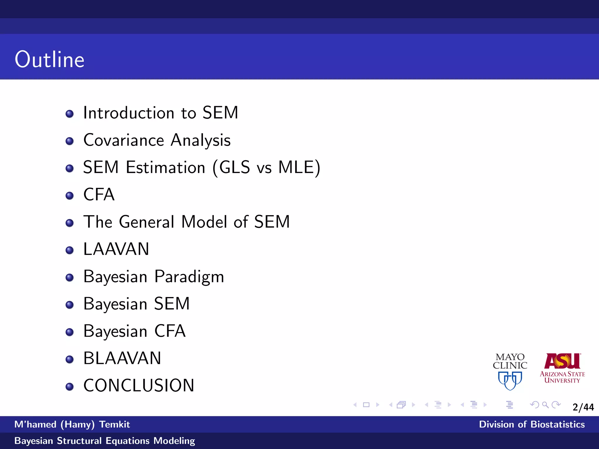 The document provides an overview of Bayesian Structural Equations Modeling (SEM), outlining its principles, terminology, and methodologies. It discusses covariance analysis, estimation techniques (GLS vs MLE), and confirmatory factor analysis (CFA). Furthermore, it includes examples of application using R, and emphasizes the integration of factor and path analysis into a coherent statistical framework.