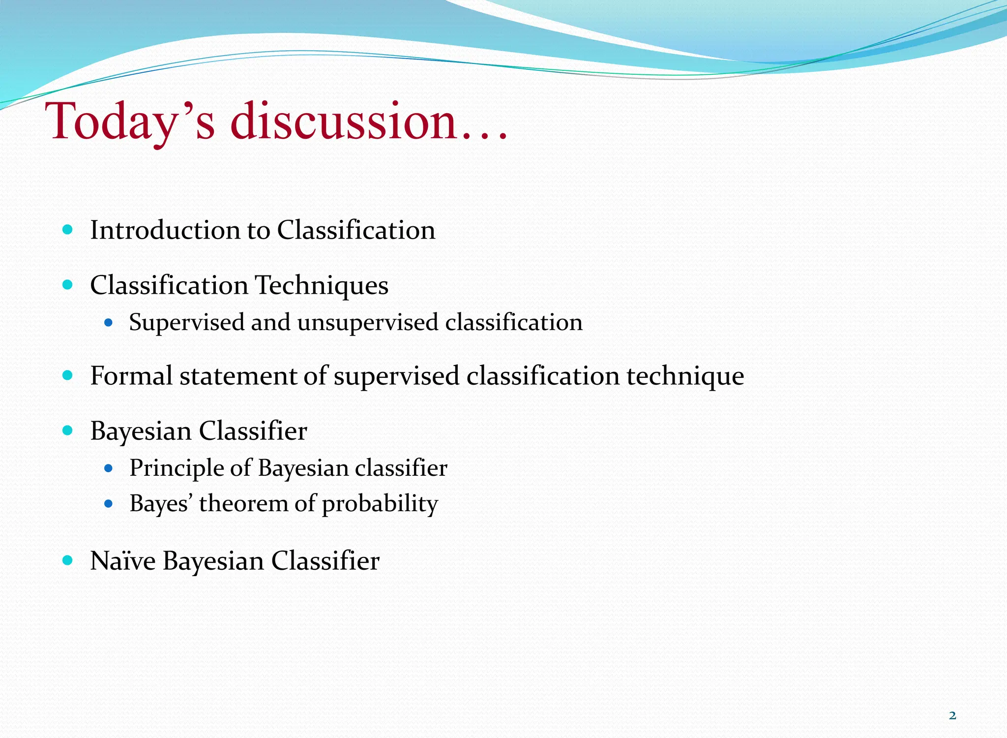 The document discusses classification techniques, focusing on the naïve bayes classifier, its principles, and applications in various fields such as life sciences and security. It explains the difference between supervised and unsupervised classification, the formal definition of classification problems, and the use of Bayes' theorem for probabilistic classification. Additionally, it highlights various classification techniques, including statistical-based methods, distance-based classification, decision trees, and machine learning approaches.