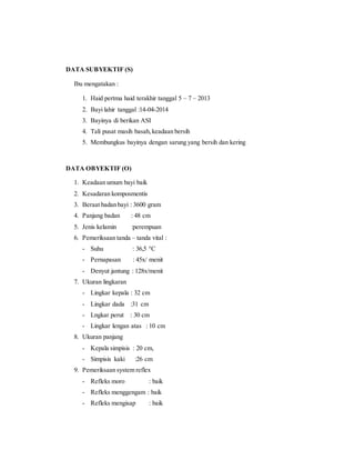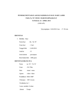 Dokumen mendokumentasikan asuhan kebidanan pada bayi baru lahir umur 1 hari bernama Ny 'D'. Pemeriksaan menunjukkan bayi lahir normal dengan berat badan 3600 gram dan keadaan umum baik. Ibu diberikan edukasi tentang gizi, tanda bahaya pada bayi, dan perawatan ASI eksklusif. Rencana perawatan meliputi observasi tanda vital bayi, memberi kehangatan, mengajarkan pergantian pakaian dan sarung basah, serta