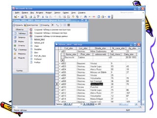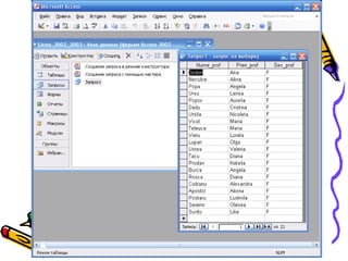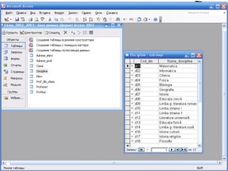 Documentul descrie conceptul și structura bazelor de date, inclusiv procesul de elaborare și gestionare a acestora. Este prezentat modul de creare a tabelelor, definirea relațiilor dintre acestea, precum și utilizarea interogărilor, formularelor și rapoartelor pentru gestiunea și vizualizarea datelor. Se subliniază importanța analizei cerințelor utilizatorilor și a menținerii corespunzătoare a sistemului de baze de date.