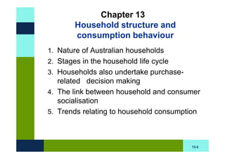 This document discusses household structures and consumption behaviors. It begins by defining different household types such as family households and non-family households. It then describes the household life cycle model and the different stages households typically go through, such as young singles, young married couples with and without children, middle-aged singles and couples with children at home or empty nests, and older singles and couples. Each life cycle stage is associated with unique consumption needs and purchasing behaviors. The document provides details about characteristics and expenditures for each life cycle stage.