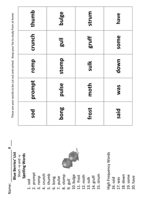 This document contains a list of spelling words for a student to study that include short-o and short-u sounds. The list is divided into two sections, one for spelling words and one for high frequency words. There are 15 spelling words and 5 high frequency words for a total of 20 words for the student to learn.