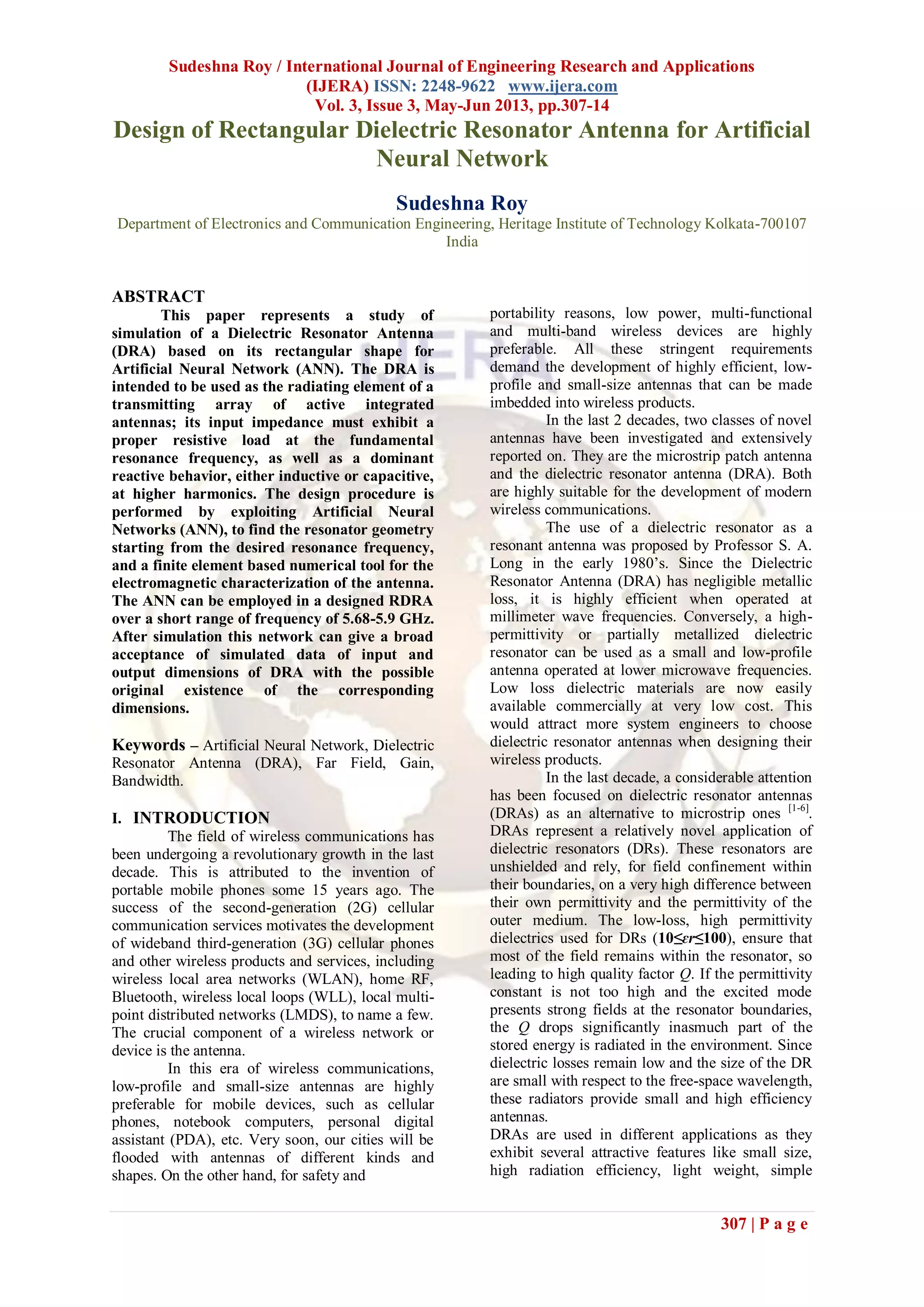 This paper presents the design of a rectangular dielectric resonator antenna (DRA) for artificial neural networks (ANN), focusing on its simulation and parameter optimization for wireless communication applications. It highlights the advantages of DRAs, such as efficiency at millimeter wave frequencies and low power loss, while also introducing the role of ANNs in determining resonator geometry. The study aims to enhance the performance and tunability of antennas, contributing to the advancement of modern wireless technologies.