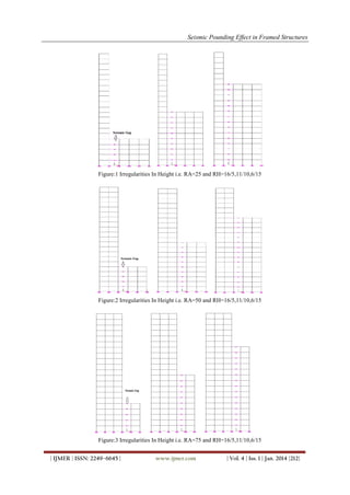 The document discusses the seismic pounding effect between adjacent structures during earthquakes, highlighting the architectural and structural damage that can result from such collisions. A case study using various building geometries investigates the minimum separation gap required to mitigate damage, concluding that a seismic gap of 10 to 15 cm is generally sufficient depending on building irregularities. The analysis emphasizes the need for adequate seismic separation in densely built metropolitan areas to prevent catastrophic failures.